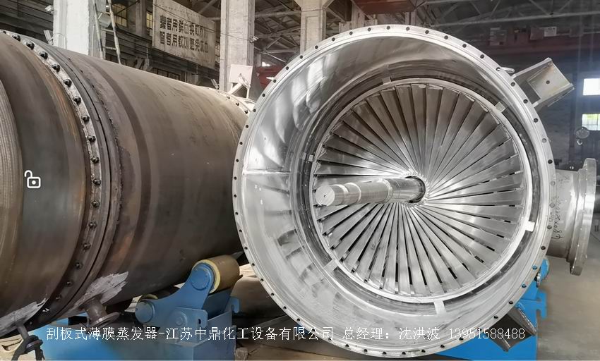 江蘇中鼎化工設備有限公司--離心式刮板薄膜蒸發器主要由加熱外盤半管式夾套(半管夾套內走蒸汽,導熱油,熔鹽或者熱水等循環給蒸發器外壁加溫,通過熱傳導,把蒸發器內壁形成的物料薄膜中的水份蒸發減少,提高物料的濃度百分比。一般設計壓力為0.3mpa~2.5mpa左右,如果是蒸汽溫度一般在180°以下,導熱油溫度一般在280°以下,熔鹽溫度一般在380°以下。刮板也稱刮刀(刮板分為:玻纖四氟刮板、碳纖維四氟刮板、石墨四氟刮板、黃銅刮板、合金鋼等)和傳動裝置:電機(普通變頻電機、防爆變頻電機、高速變頻電機),減速機(擺線針輪減速機、齒輪減速機),機架,軸封系統(單端面機械密封、雙端面機械密封、磁力密封等,如果抽真空必須選用雙端面機械密封或者磁力密封),轉動軸、汽液分離裝置、液體分布器、蒸發器轉子支架、軌道刮板槽、底部軸套等部件組成。外盤半管內或者夾套內通加熱的熱源,刮板裝在可旋轉的軸上,刮板和加熱夾套內壁保持很小間隙,通常為0.5~1.5 mm。在旋轉時通過離心力,使刮板與內壁緊密接觸。把物料從壁上刮下。料液經預熱后由蒸發器上部進料口沿切線方向噴進,通過液體分布器分散盤把液體均勻分布到蒸發器筒體表面,在重力和旋轉刮板的作用下,均勻分布在蒸發器內壁形成下旋薄膜,并在下降過程中不斷被蒸發濃縮,完成液由底部排出,二次蒸汽向上從頂部倉逸出(一般通過真空泵抽出)二次蒸汽再通過汽液分離器、冷凝器處理。在某些場合下,這種蒸發器可將溶液蒸干,在底部直接得到固體產品。這類蒸發器的缺點是結構復雜制造\安裝和維修工作量大。